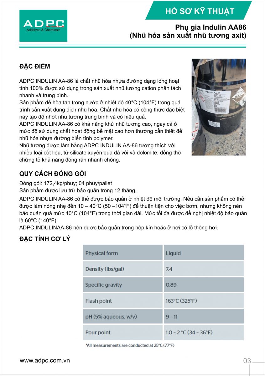 ADPC INDULIN AA-86 là chất nhũ hóa nhựa đường dạng lỏng hoạt tính 100% được sử dụng trong sản xuất nhũ tương cation phân tách nhanh và trung bình.