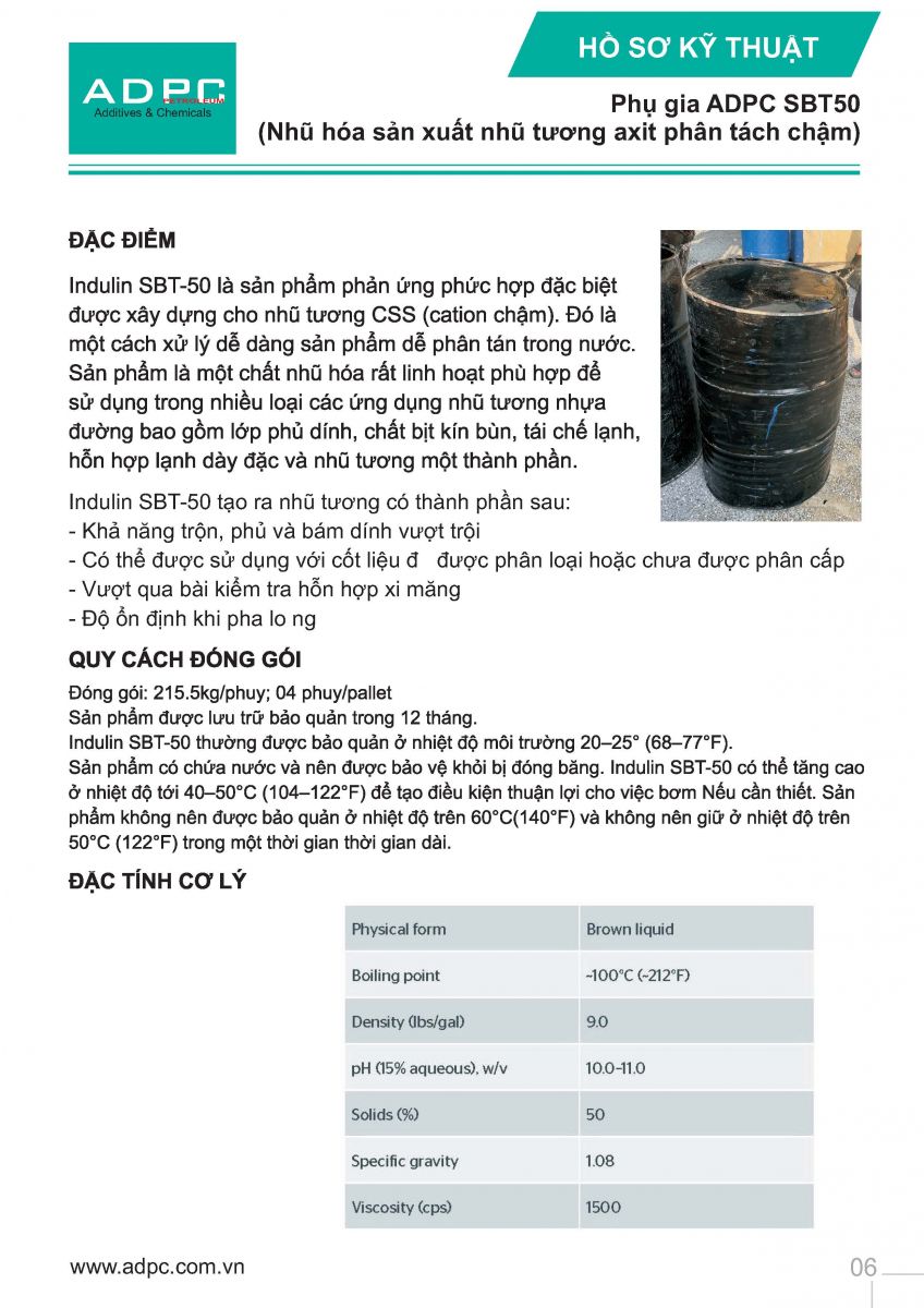 Indulin SBT-50 là sản phẩm phản ứng phức hợp đặc biệt được xây dựng cho nhũ tương CSS (cation chậm). Đó là một cách xử lý dễ dàng sản phẩm dễ phân tán trong nước.