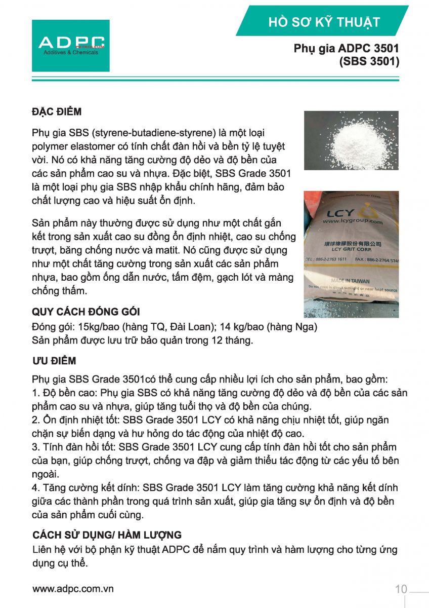 Phụ gia SBS 3501 là phụ gia tăng cứng cho asphalt, đồng thời tăng độ bám dính với đá của bê tông nhựa nóng, được trộn trực tiếp vào bê tông nhựa nóng trong quá trình trộn tại trạm.